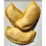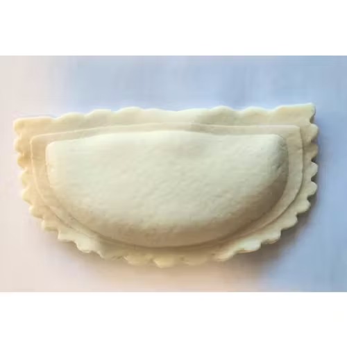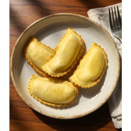 Empanada de queso media luna de 50 g, con masa crujiente y relleno de queso gouda, ideal para catering y eventos.