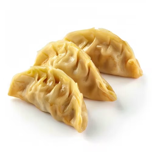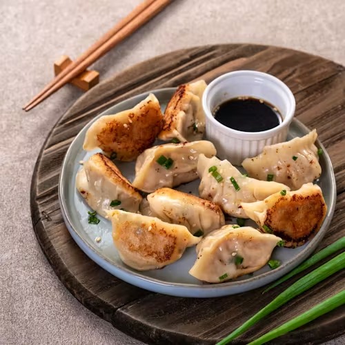 Gyozas tradicionales rellenas de cerdo, repollo y cebollín, ideales como entrada o aperitivo oriental.