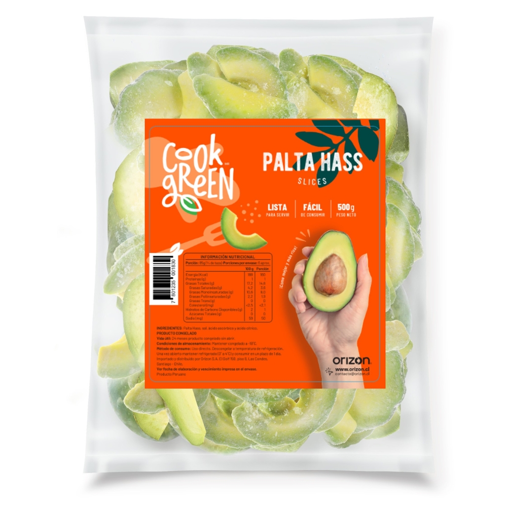 Palta Hass congelada en gajos, lista para usar. Mantiene su color y textura natural gracias a sus antioxidantes (C/A: con antioxidantes que evitan la oxidación y preservan la frescura). Marca: COOK GREEN. Presentación: 20 bolsas de 500 g.