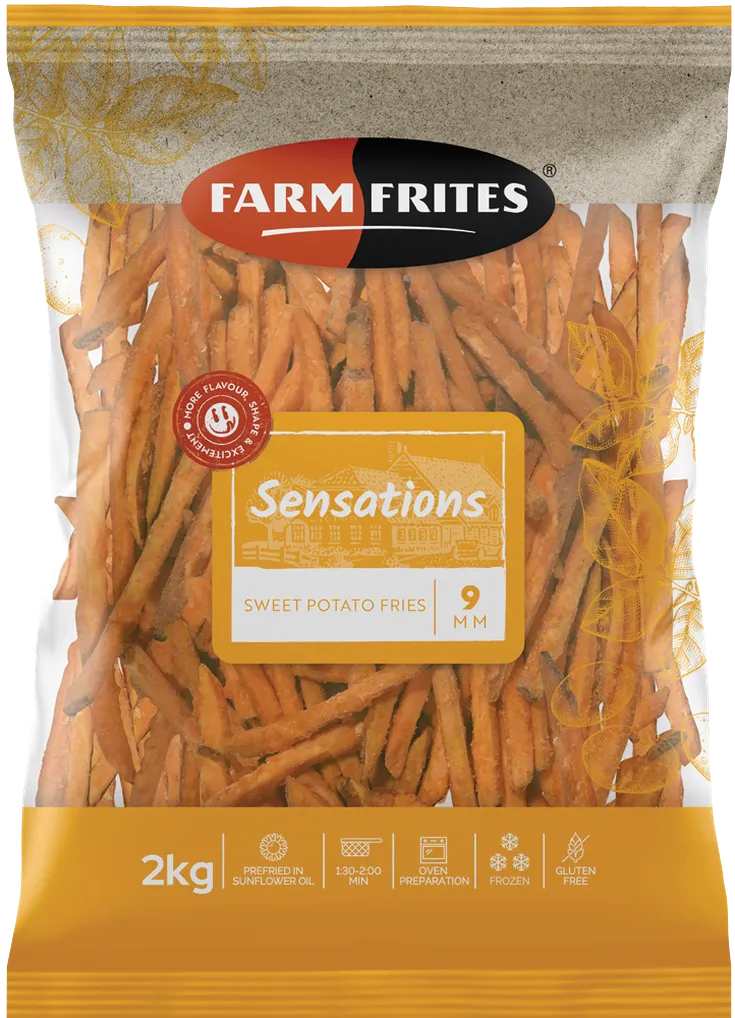 Camote en bastón para fritura, dulce y crujiente. Marca: Farm Frites. Presentación: 5 bolsas de 2 kg.