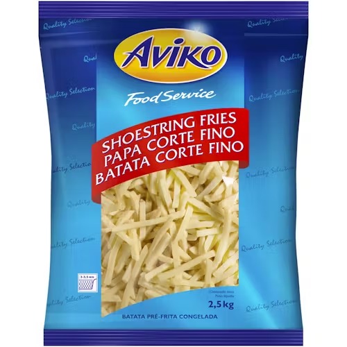 Papas pre-fritas congeladas de corte fino (7 mm), ideales para lograr un acabado dorado y crujiente en preparaciones profesionales.