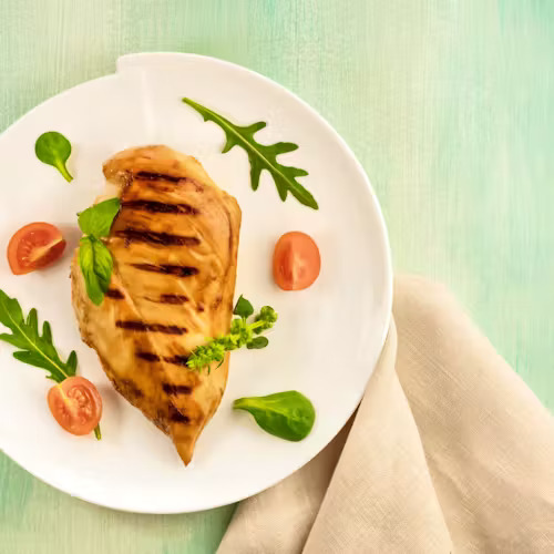 Media pechuga de pollo deshuesada y sin piel, marinada y congelada mediante proceso IQF. Producto de alta calidad con marinado de hasta 18% y glaseado entre 2-3%