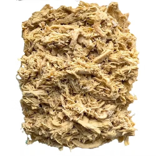 Pollo desmechado premium, cocido y sazonado con especias y vegetales frescos, ideal para preparaciones gastronómicas profesionales.